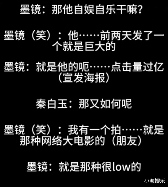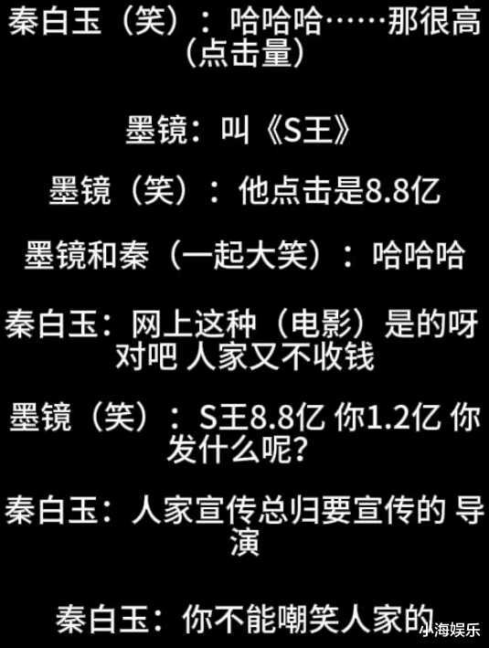 随后,几人还讨论起了张一白,因张一白的网大电影点击率过亿,于是发了一个海报。王家卫又开始嘲讽,张一白在那里自娱自乐。称自己朋友电影点击率8.8亿都没有发海报,你1.2亿发什么呢?