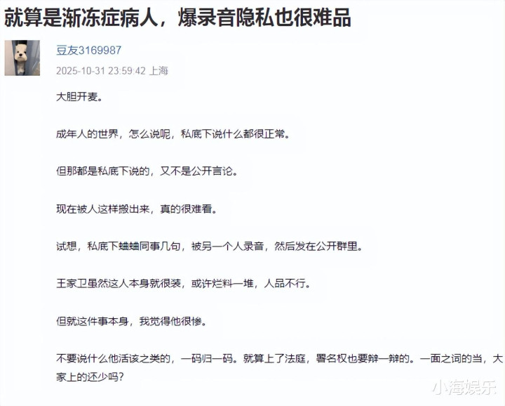 而对于古二接连爆料私下录音的行为,网友们也是发表了不同的看法。有网友认为,即便古二是渐冻症病人,但曝光录音隐私也很难品,私下说的又不是公开言论,不该被这样搬出来。且署名权一直是古二一面之词。