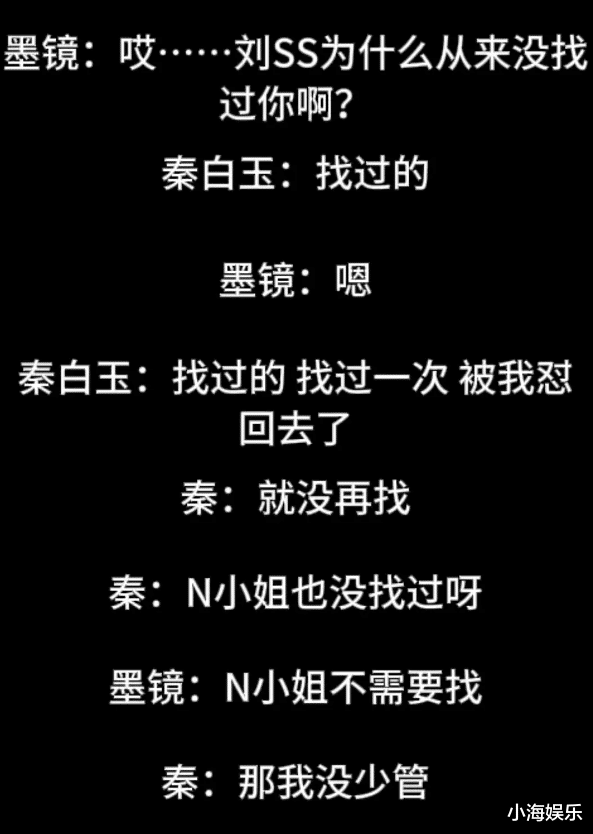 而几人蛐蛐刘诗诗、马伊琍、妮妮等,这几位吐槽的就比较委婉了,大致是刘诗诗找过秦雯要资源,被怼回去了,妮妮的事情秦雯没少张罗。还有马伊琍一直学秦雯语气说话等等。