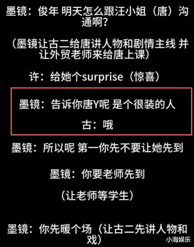先来总结一下最新录音的内容:王家卫安排古二次日给唐嫣讲故事线和剧情,并要请外贸老师给唐嫣上课。但特意交代让外贸老师先到场等唐嫣,直言唐嫣是个很装的人。