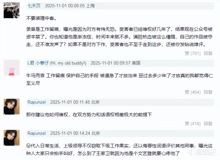 而力挺古二的网友则认为,录音是工作留痕,曝光也是因对方有恃无恐,因为古二已经维权几年没有结果,账号也被封禁,不得已为之。时间本就不多了,自己的作品被掠夺,难道不能发声了?